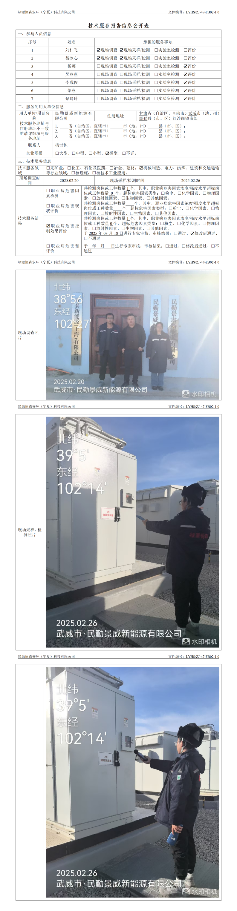 民勤景威新能源有限公司10萬千瓦風電項目職業病危害控制效果評價報告技術服務報告信息公開表